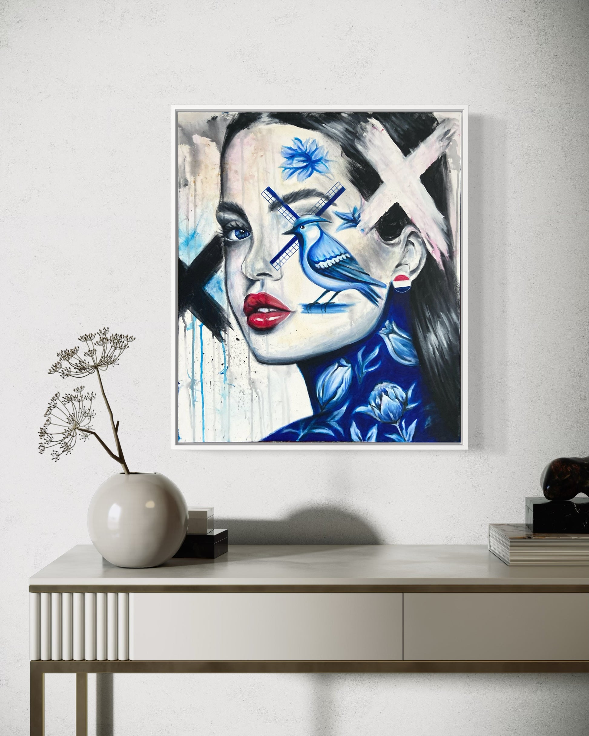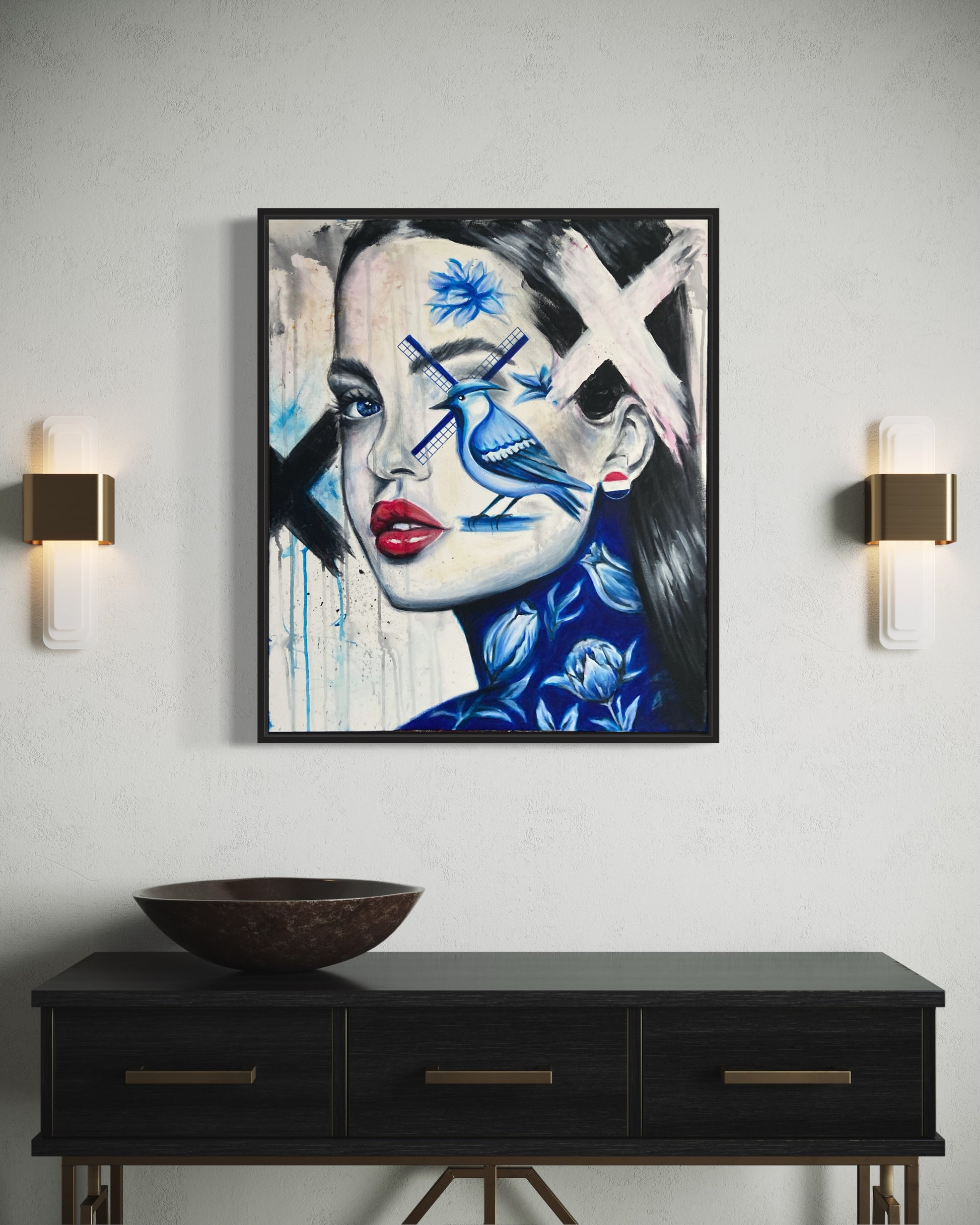 This canvas print was inspired by Netherlands, from the collection “Friendship celebration”. Immerse yourself in the rich cultural tapestry of the Netherlands with this evocative painting portrait of a Dutch woman. The artwork is infused with iconic symbols, including the Amsterdam cross logo, windmills, vibrant tulips, and a graceful bird, all elements deeply rooted in Dutch heritage. These symbols not only celebrate the beauty of the Netherlands but also convey a sense of pride and resilience. Perfect for those who appreciate art that captures the essence of Dutch culture and feminine strength.